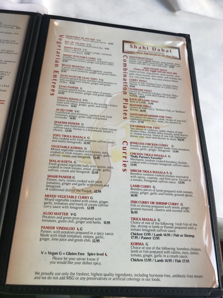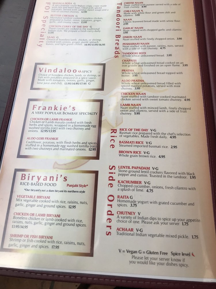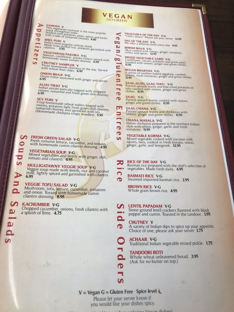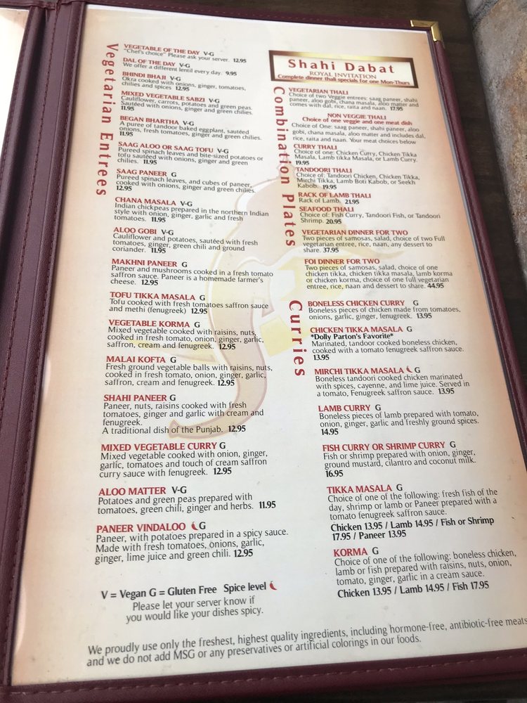 Two vegetarian choices :- saag paneer, shahi paneer, aloo gobi, chana masala, aloo matter and comes with dal, raita, rice, naan.