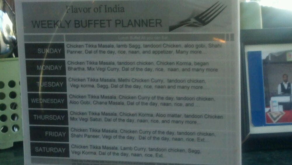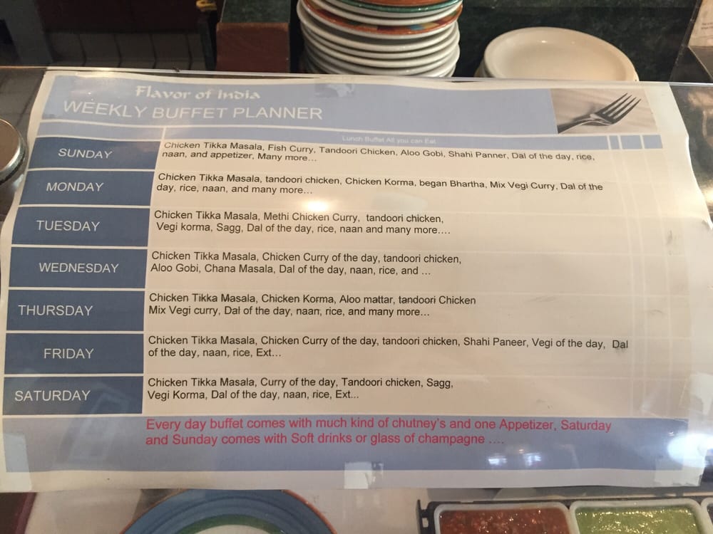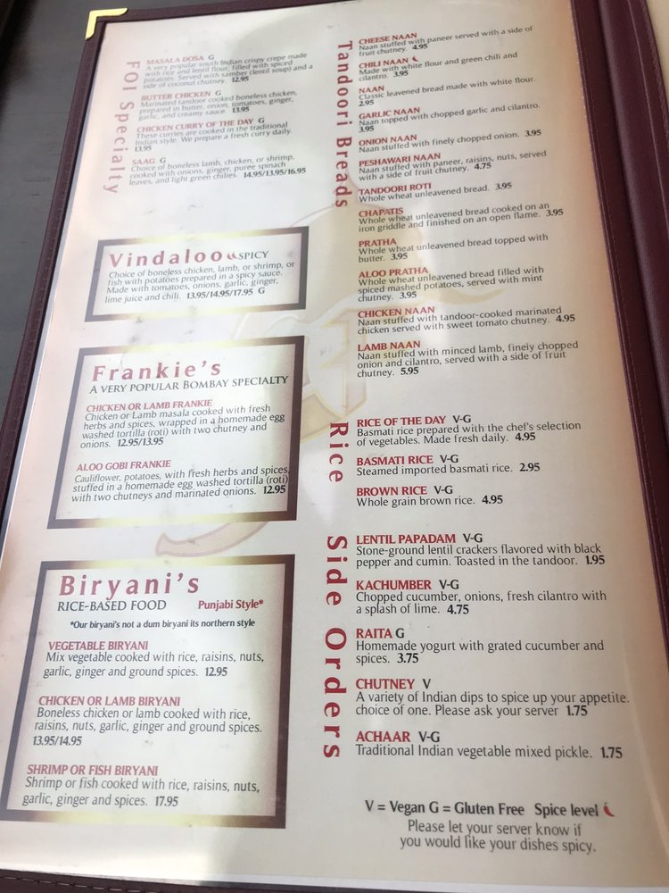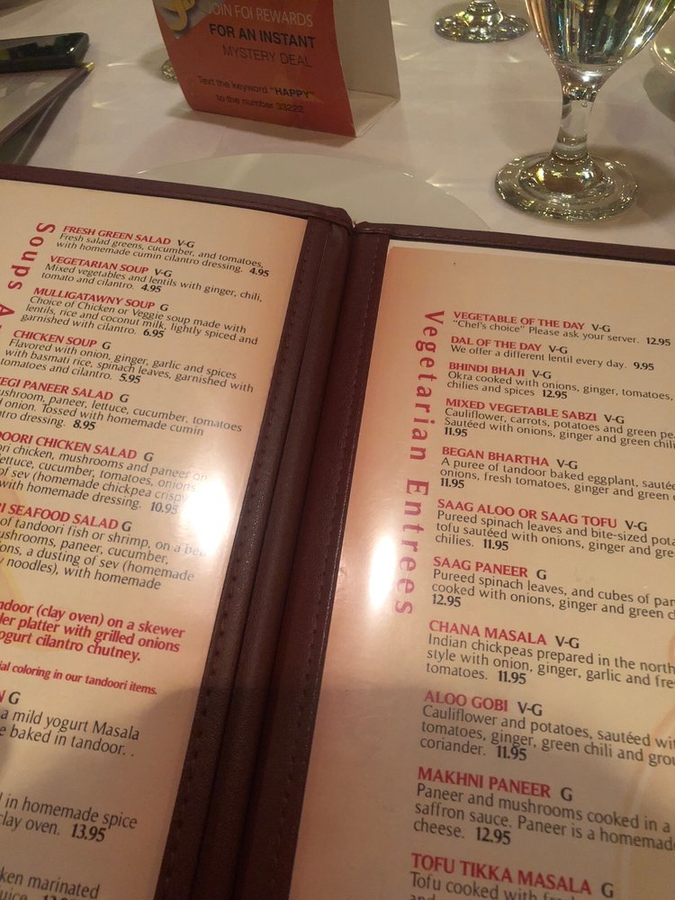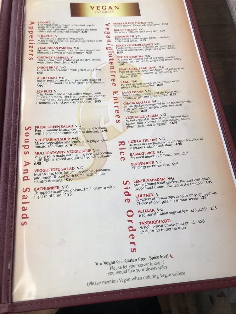 Two vegetarian choices :- saag paneer, shahi paneer, aloo gobi, chana masala, aloo matter and comes with dal, raita, rice, naan.